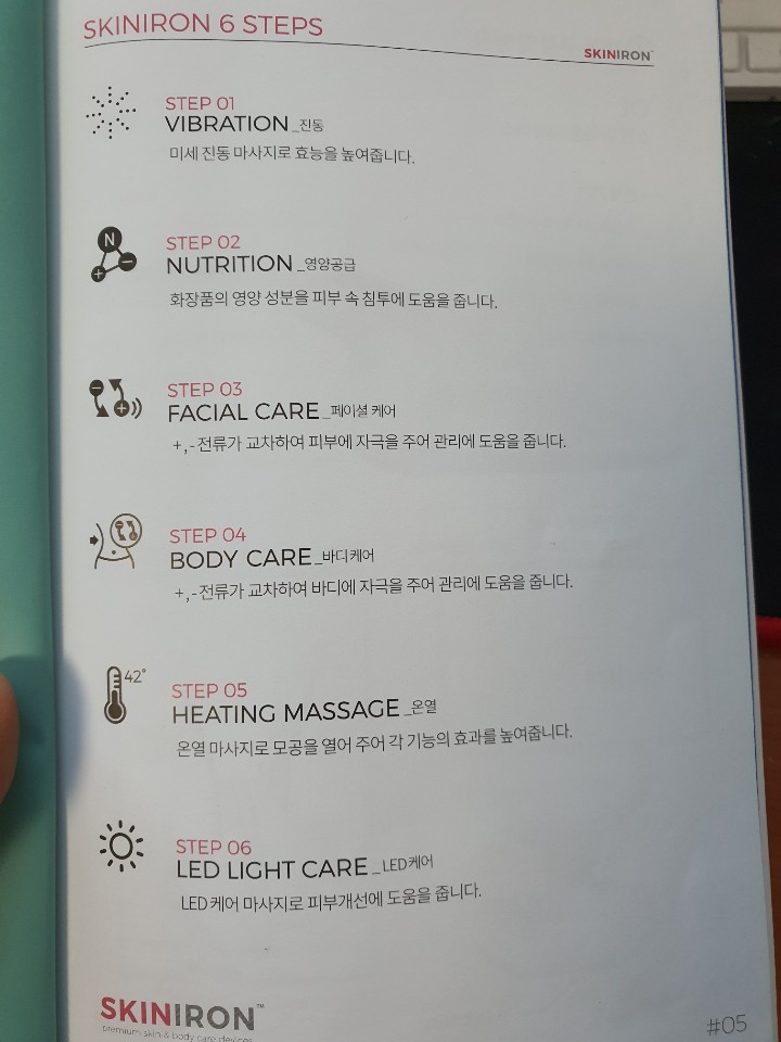 동봉된 사용설명서에 있는 6가지 기능에 대한 간단한 소개예요. 진동, 영양공급, 페이셜 케어, 바디케어, 온열, LED케어 까지 한 디바이스로 쓸 수 있는 게 장점인 것 같아요. 저는 게을러서 바디케어는 잘해주고 있지 않지만ㅠㅠ 이것도 써봐야겠습니다!