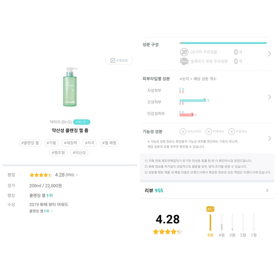 사실 이 제품이 더 끌렸던 이유는 화해 클렌징 젤 부문에서 랭킹 1위를 했던 것도 있었던 것 같다.