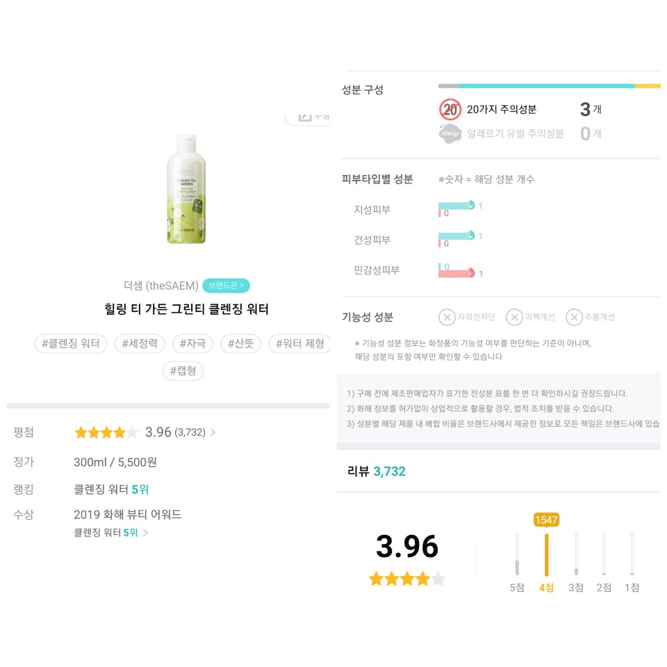 나는 성분을 잘 따져보는 편인데 솔직하게 말하면 힐링 티 가든 그린티 클렌징 워터는 성분이 아주 많이 착한 편은 아니다. 20가지 주의 성분 중 3가지- '피이지-7 카프릴릭/카프릭 글리세라이드', '피이지-7 글리세린 코코 에이트', '페녹시에탄올'-을 포함하기 때문이다. 하지만 나는 이번에 클렌징 워터를 선택하는 기준을