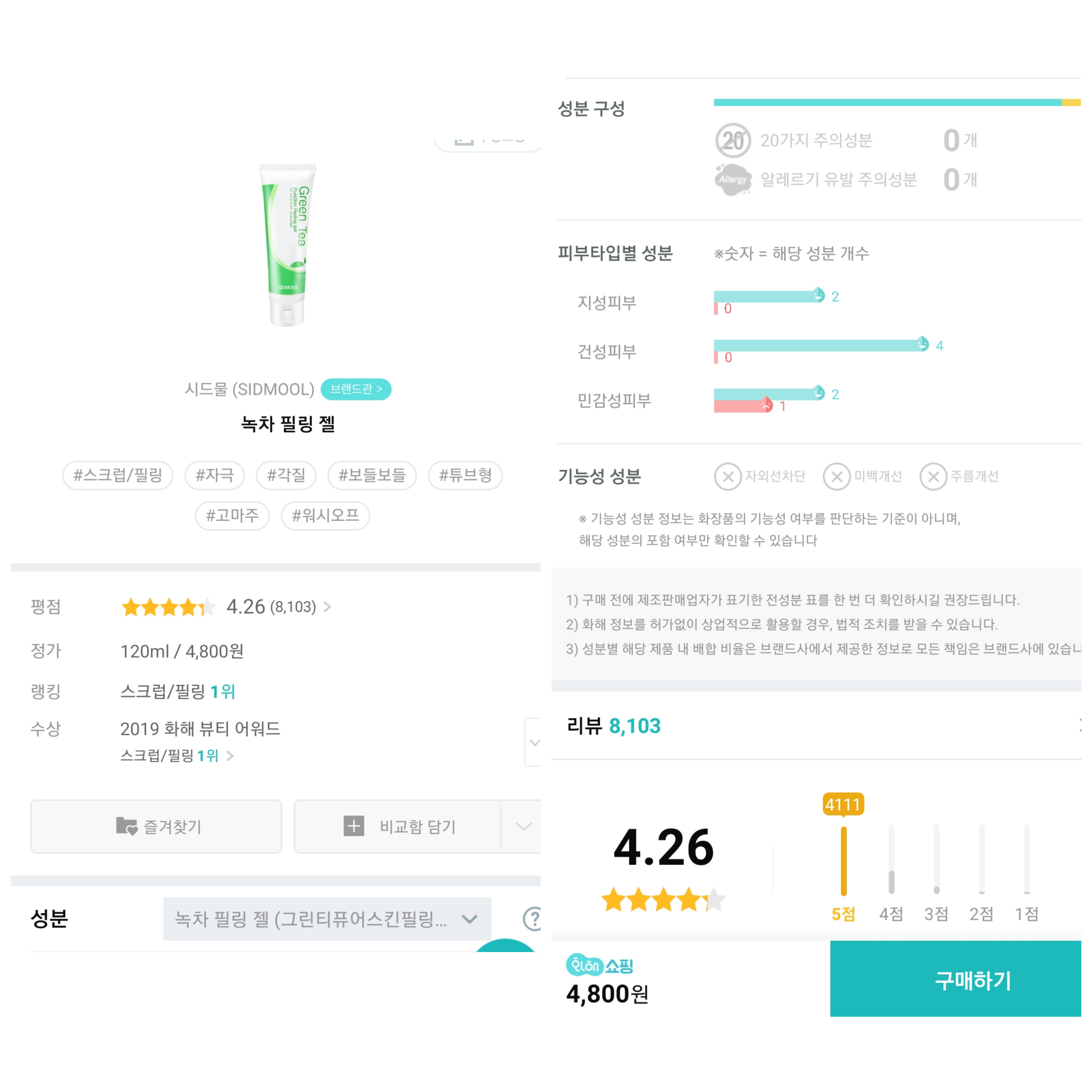 이제 시드물 녹차 필링젤의 성분을 알아보도록 하자.